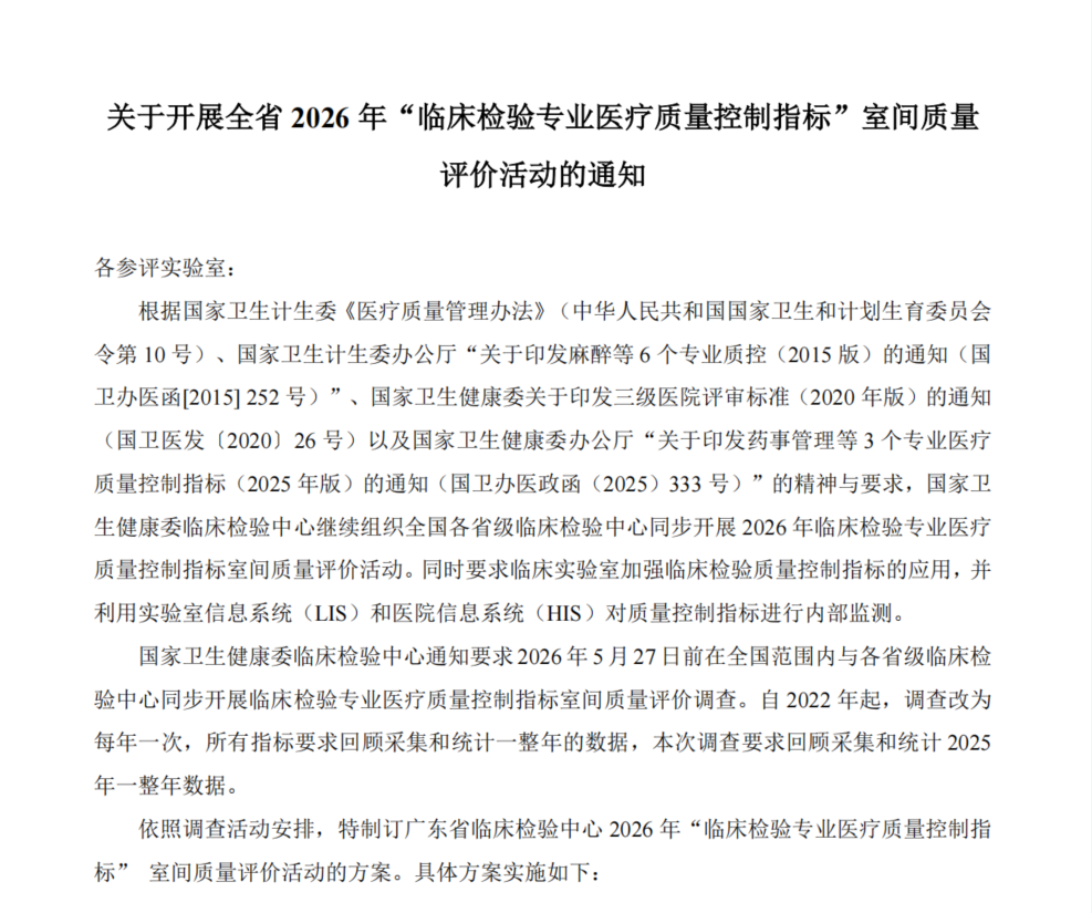 关于开展全省2026年“临床检验专业医疗质量控制指标”室间质量评价活动的通知