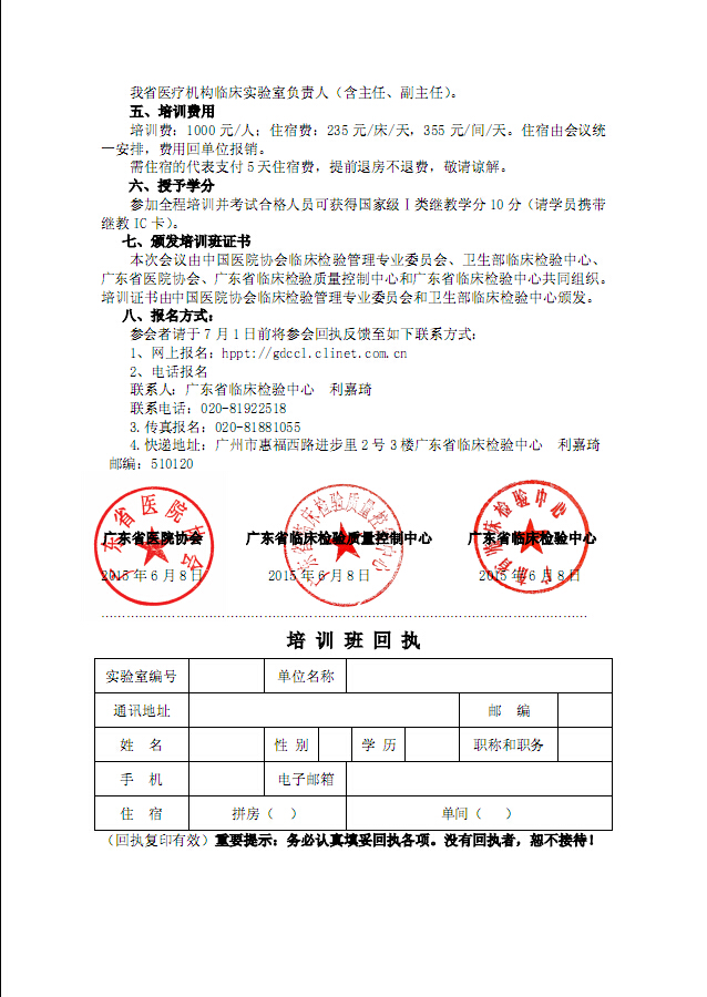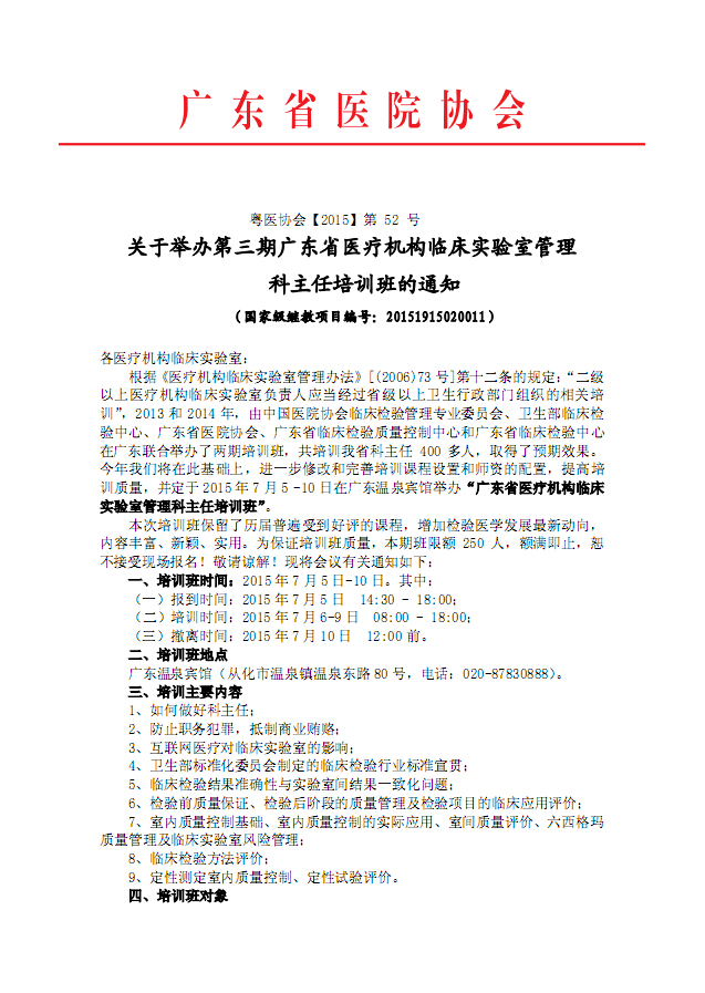 关于举办第三期广东省医疗机构临床实验室管理科主任培训班的通知
