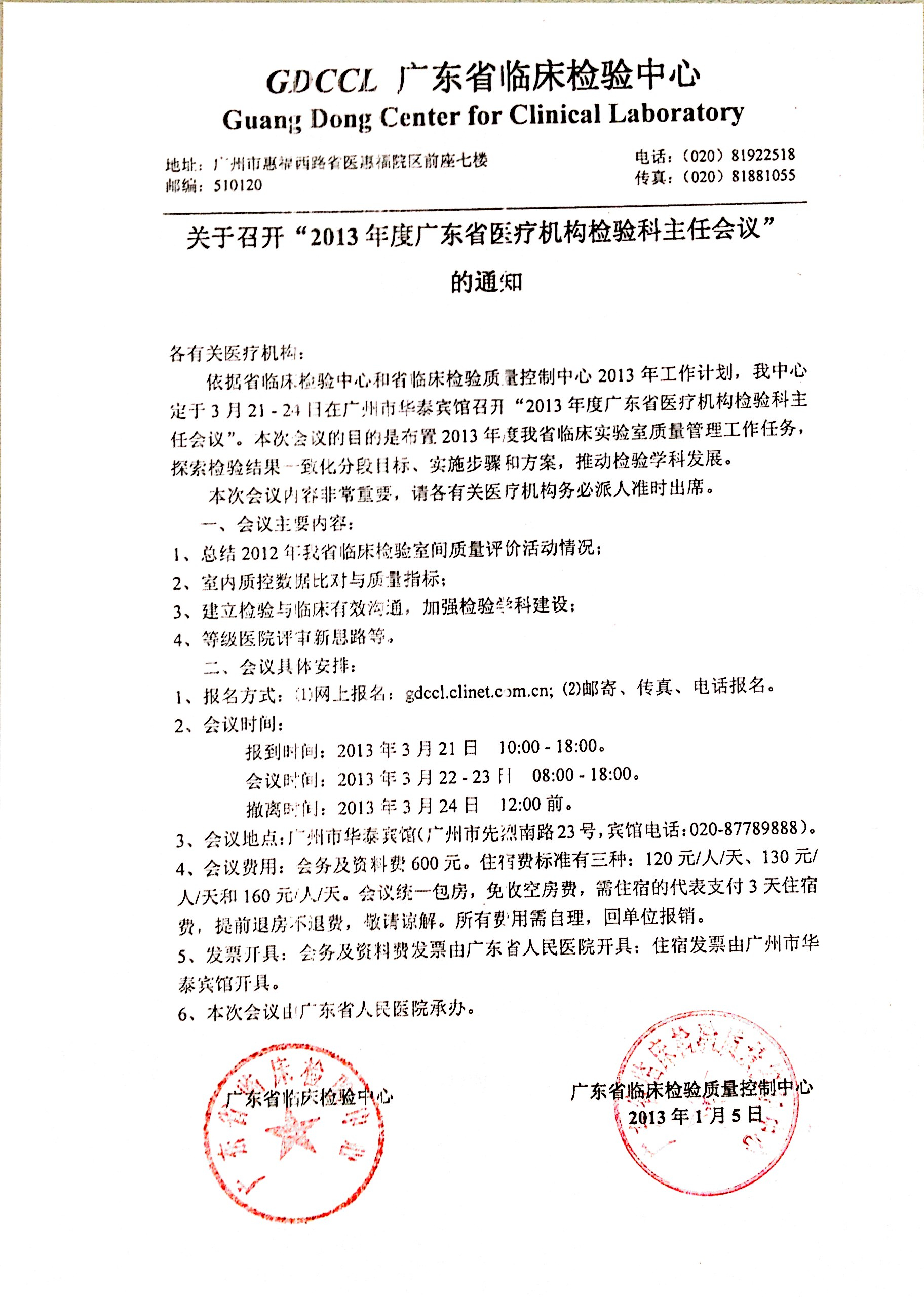 依据省临床检验中心和省临床检验质量控制中心2013年工作计划,我中心定于3月21 - 24日在广州市华泰宾馆召开“2013年度广东省医疗机构检验科主任会议”。本次会议的目的是布置2013年度我省临床实验室质量管理工作任务,探索检验结果一致化分段目标、实施步骤和方案,推动检验学科发展。